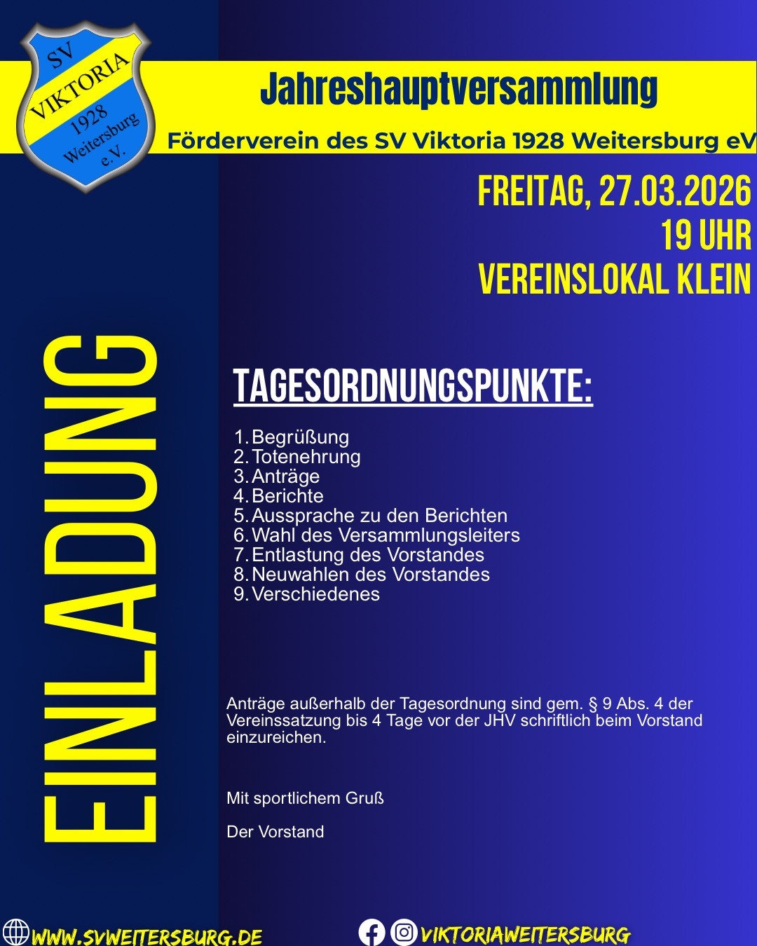 Als wichtiger Bestandteil des SV Viktoria wird der Förderverein über zahlreiche Aktivitäten berichten, mit denen er den Hauptverein im vergangenen Jahr unterstützt hat. Da zudem Neuwahlen anstehen, freuen sich die Verantwortlichen über eine rege Teilnahme der Mitglieder des Fördervereins.