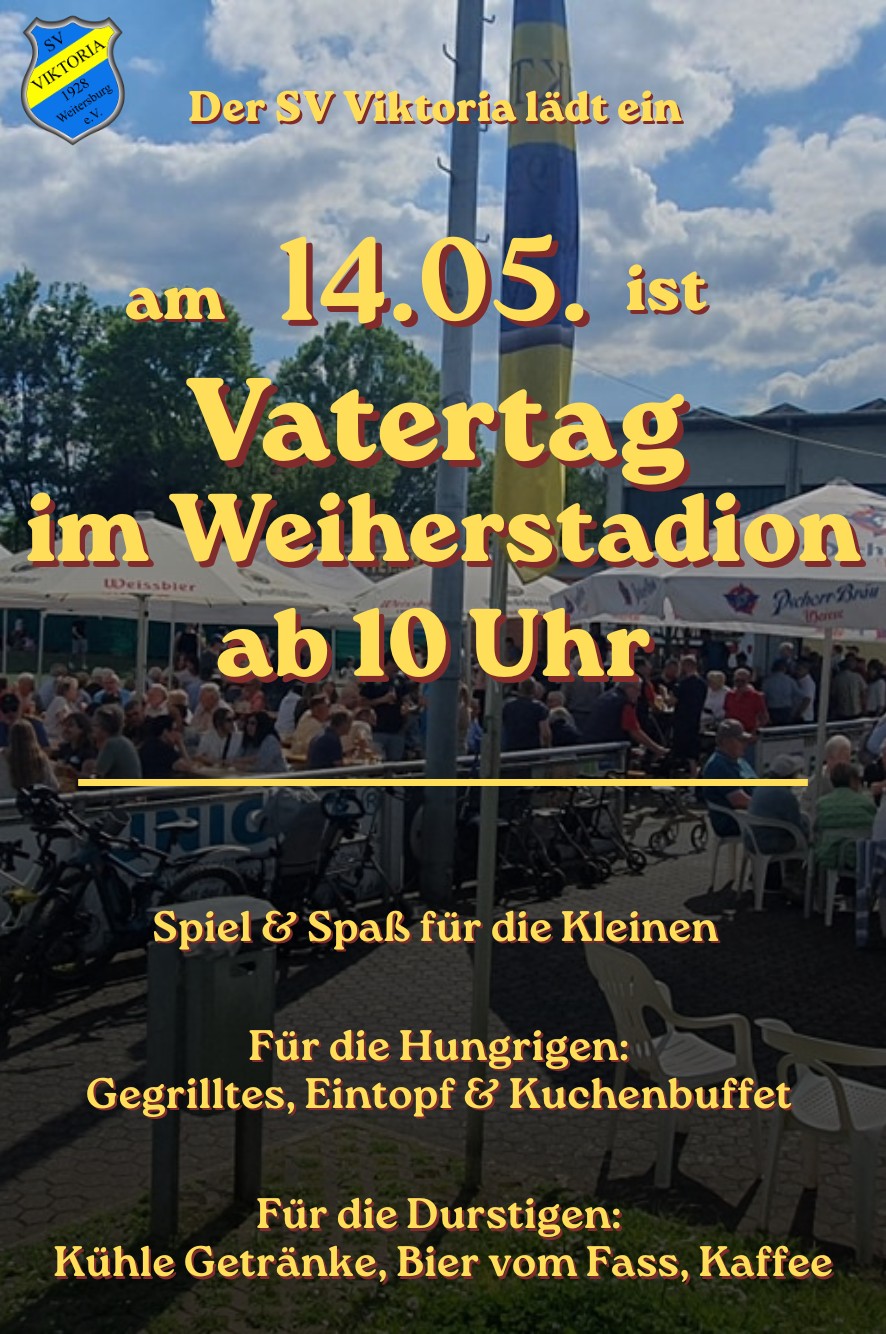Der SV Viktoria lädt alle Wanderer und Gäste an Vatertag herzlich ins Weiherstadion ein. Ab 10:00 Uhr gibt es kühles Bier vom Fass, Gegrilltes, herzhaften Eintopf und am Nachmittag ein großes Kuchenbuffet. Das Weiherstadion bietet viel Platz zum Verweilen, Toben und Kicken für die ganze Familie.